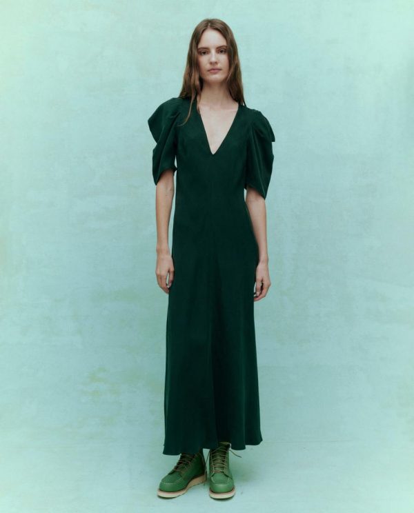 This 1930’s inspired dress has a bias cut, which is slim through the body with a flowy ease towards the hem. It has a simple, deep-V cut neckline, and voluminous, romantic sleeves, pleated at the shoulder and drapes to hit at the elbow. There is a signature vintage (hidden) detail – a small weight sits inside the sleeve at the shoulder forming, and holding, its beautiful shape. Cut in a weighty viscose for the Holiday season.