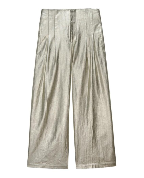 The Sculpted Trouser is crafted from soft metallic foil-coated twill, with a smooth laminated exterior that boasts a luxurious feel, with the soft cotton interior. With a high-waisted silhouette snug through the hips, wide and loose through the leg, it hits at the ankle, with side seam pockets, and a clean, pleated waistline.