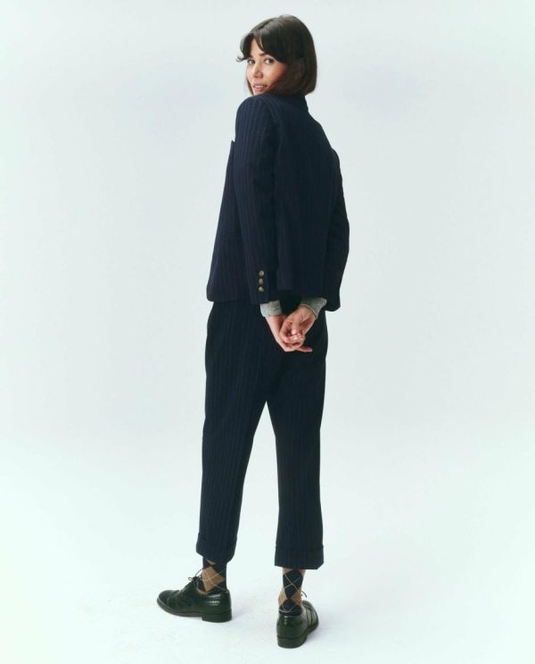 The Tradesman Pant. is a true Fall staple. Cut from a soft pinstripe suiting, this quintessential tailored trouser fits relaxed through the body and features pleats at the front waist, straight legs, side seam pockets, back pockets, and pressed cuffs at the hem. Style them back to The Suit Vest. and The Shlumpy Blazer. for the coolest three-piece suit.