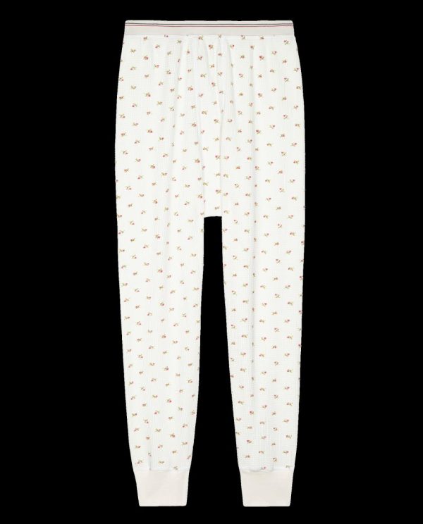 Inspired by vintage long johns, this soft pant has a low gusset, and a striped elastic waistband.It is cut in our classic thermal waffle fabric and printed with our seasonal heirloom rose.