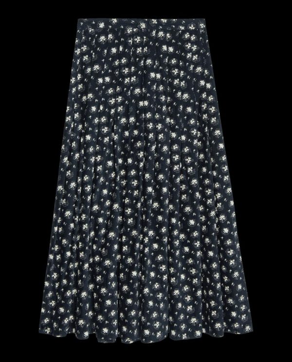 This midi skirt is inspired by passed-down vintage party skirts. Cut from a soft and light weight baby wale cord on the Night Lily Print, The Rhythm Skirt features a flat waist band with pleated pintucked details. It fits slim through the hips and eases into a full swingy skirt that hits just below the calf, complete with a chunky metal zipper at the back body.