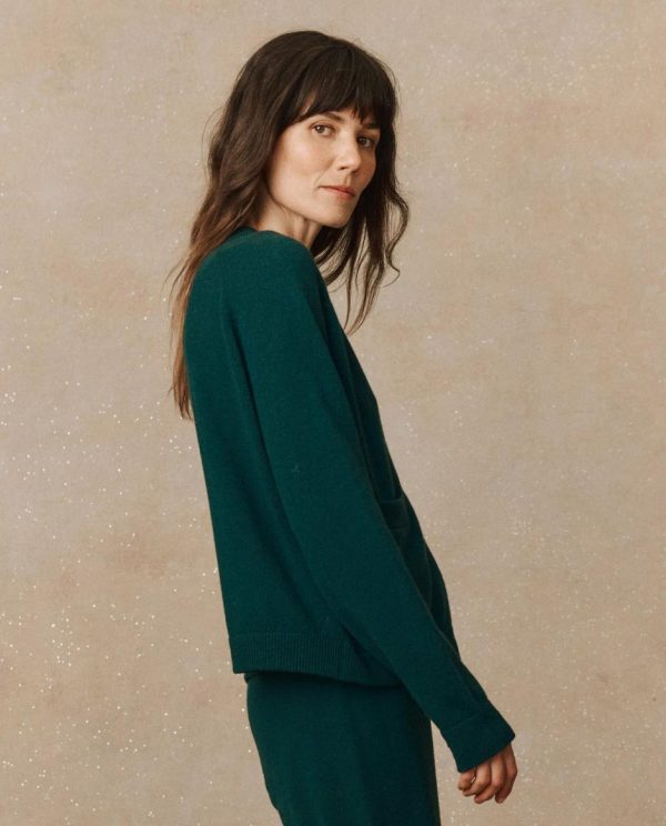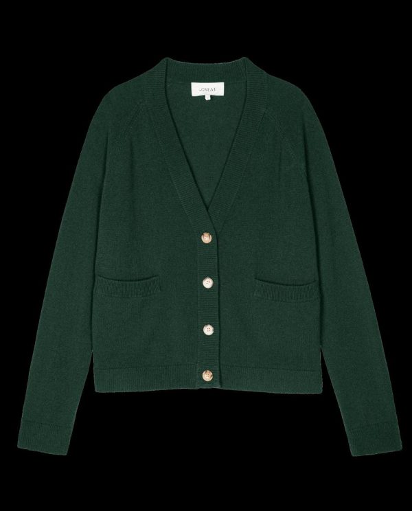The Varsity Cardigan. is made from our cozy cashmere and features an easy boxy fit, open v-neckline, authentic horn buttons, and raglan arm holes.